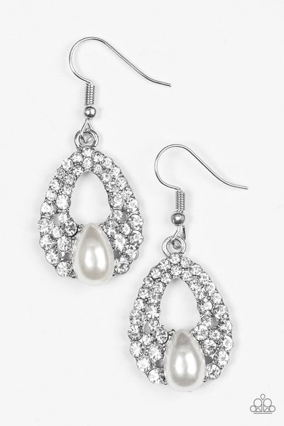 Varying in size and shimmer, glassy white rhinestones are encrusted along a teardrop frame. A pearly white bead is pressed into the bottom of the frame for a refined finish. Earring attaches to a standard fishhook fitting.