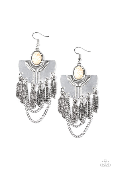 A fringe of antiqued silver feathers and shimmery silver chains dangle from the bottom of a fanning silver frame dotted with a smooth white stone for an earthy finish. Earring attaches to a standard fishhook fitting.
