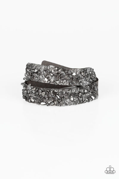 A collection of crushed silver rocks and glassy hematite rhinestone prisms are sprinkled across a gray suede band for a seasonal look. The elongated band allows for a trendy double wrap design. Features an adjustable snap closure.