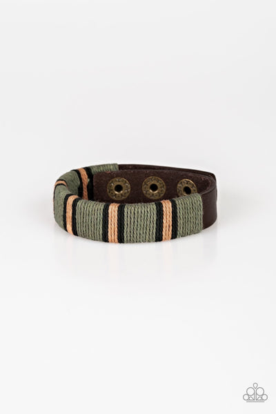 Earthy black, brown, and green thread winds around a brown leather band for a rustic look. Features an adjustable snap closure.