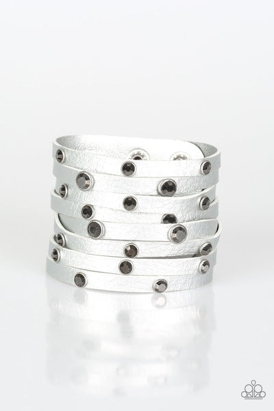 Brushed in a metallic shimmer, a thick gray leather band has been spliced into eight strips across the wrist. Encased in sleek silver fittings, glittery hematite rhinestones are sprinkled across the center for a sassy finish. Features an adjustable snap closure.