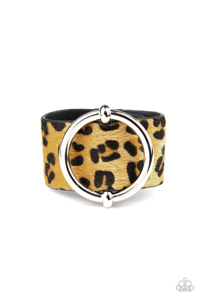 A dramatically oversized silver ring slides along a thick black leather band featuring fuzzy yellow cheetah print for a wild finish. Features an adjustable snap closure.