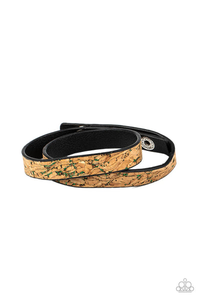Haphazardly flecked in green glitter, an earthy cork-like band delicately wraps around the wrist. The elongated leather band allows for a trendy double wrap design. Features an adjustable snap closure.
