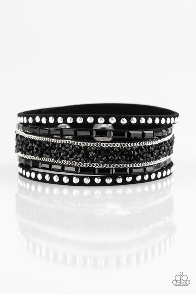 Featuring edgy emerald and prism style cuts, glassy black rhinestones are encrusted down the center of a black suede band that has been spliced into three. Shiny silver studs and glistening silver chains are added for a sassy industrial finish. Features an adjustable clasp closure.