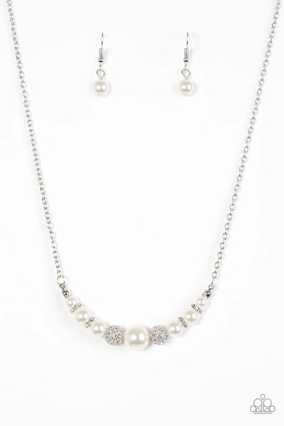 Encrusted in glassy white rhinestones, sparkling silver beads and pearly white beads are threaded along a wire, creating a refined pendant below the collar. Features an adjustable clasp closure.