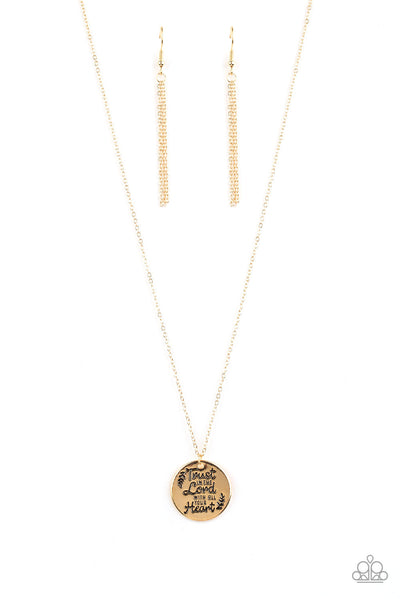 Infused with leafy accents, a dainty gold pendant is stamped in the inspirational phrase, "Trust In The Lord With All Your Heart". Features an adjustable clasp closure.