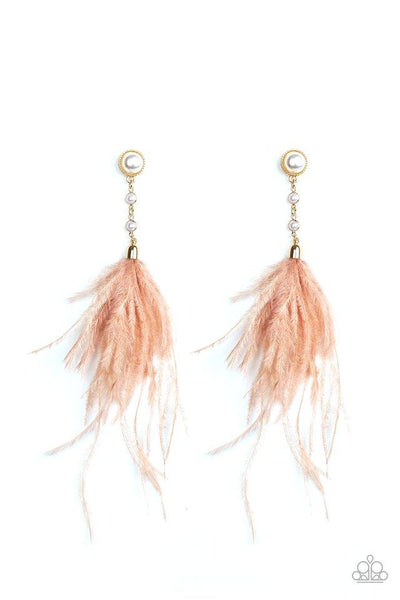 A plume of soft feathers flares out from the bottom of linked pearl-dotted gold frames for a refined flair. Earring attaches to a standard post fitting.