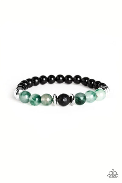 An earthy assortment of shiny black beads, glassy green stone beads, glistening silver accents, and a single black lava rock bead are threaded along a stretchy band around the wrist for a refreshing look.