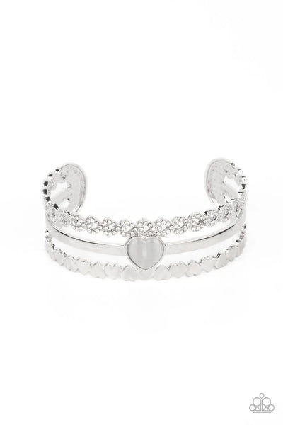 Three bands of silver arc across the wrist to create a romantic-inspired cuff. A row of white rhinestone-studded hearts are turned on their sides, gracing the top band of the cuff while solid silver hearts alternate end-over-end to create the bottom band. A sleek bar of silver topped with a white, heart-shaped, cat's eye stone falls between the outer bands, emerging as a polished focal point in a whimsical finish.