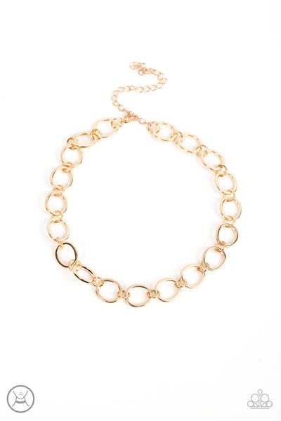 Imperfectly shaped gold circles link together around the neck for a gritty industrial statement. Features an adjustable clasp closure.
